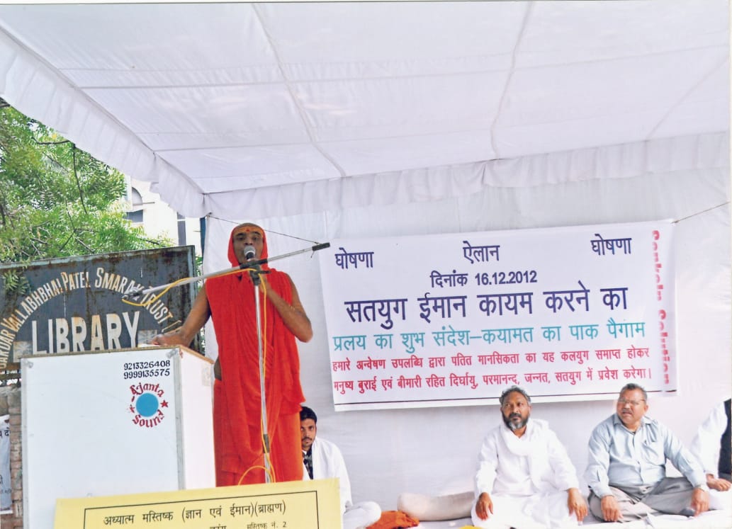 था जिससे विश्व में दिन-प्रतिदिन अँधेरा होता आया है और मनुष्य के भौतिक मस्तिष्क से धर्म, राजनीति, विज्ञान, द्वारा ना-ना प्रकारका अविष्कार करके व्यक्ति को सुख,शांति,आनन्द,का जीवन प्रदान करने का प्रयास कर रहा है । पर मनुष्य एक प्राकृतिक प्राणी है और शरीर के बहार का कोई भी अविष्कार मनुष्य के अंदर उसके प्रकृति वाद का परमानंद या स्वर्ग – जन्नत की जीवन क्रिया को क्रियान्वित नहीं कर सका है वल्कि इन भौतिक अविष्कारों से मनुष्य पूर्व की अपेक्षा आज और भी अधूरा हो गया है ।अभी हम * सनातन पुरूष * के द्वारा सनातन सिद्धान्त का वैज्ञानिक प्रमाण प्रस्तुत होगा जिसकी प्रयोग क्रिया एक अति दुर्लभ जीवन आनंद भी है इस प्रयोग द्वारा जीवन आनन्द की प्राप्ति के लिए नशे में लुप्त हो रहे सभी मनुष्य सरलता पूर्वक अपने मस्तिष्क में अशांति पैदा करने वाली तरंग को समाप्त करके नशे से भी अनन्त गुना उँचा प्राकृतक मस्तिष्क के परमानंद – स्वर्ग – जन्नत के जीवन क्रिया में स्थापित होकर भगवान – पैगम्बर के जैसे पाक मानसिकता में अन्तर्मुखी होते चले जायेंगे इससे व्यक्ति की मृत्यु दुःख रहित होगी और उसके रूह या आत्मा का मोक्ष हो जायेगा या व्यक्ति चाहेगा तो अपने प्राकृतिक मस्तिष्क में कामना करके * हजरत मूसा अली सलाम एवं महात्मा कबीर *जैसे अपने शिथिल शरीर को मृत्यु से पूर्व ही वायु मंडल में लुप्त कर लेगा ऐसी विलुप्त मृत्यु जंगल के सभी स्वतंत्र जीव धारी प्राणियों की होती है इसके साथ ही धर्म, राजनीति, विज्ञान का महत्व समाप्त हो जाता है यही युग परिवर्तन है तथा यही सत्ययुग, ईमान कायम है।